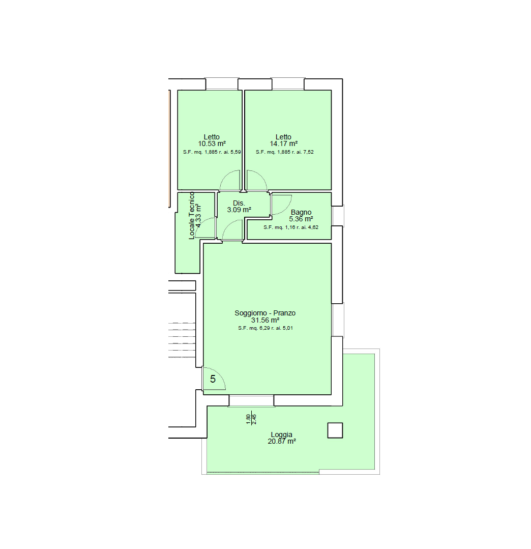 La soluzione proposta si trova al piano secondo, servita d'ascensore, ed è composta da: soggiorno con angolo cottura con accesso al terrazzo, camere da letto matrimoniale, camera da letto singola, bagno e ripostiglio.